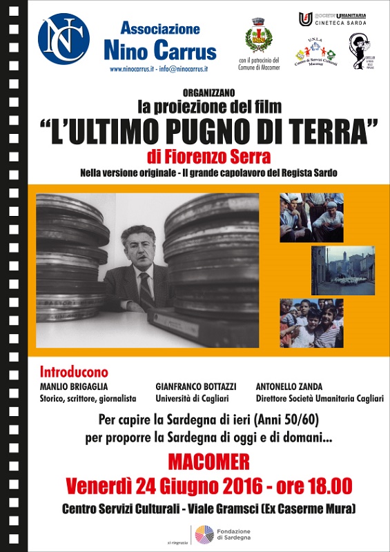L'Associazione Nino Carrus vi invita alla proiezione del film 'L'ultimo pugno di terra' di Fiorenzo Serra per Venerdi 24 giugno 2016, alle ore 18,00, presso il Centro Servizi Culturali di Macomer.