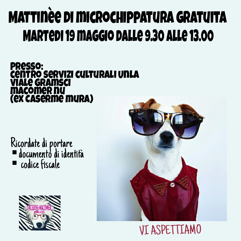 MACOMER. L'Associazione Facedog Onlus, in collaborazione con il Centro Servizi Culturali UNLA di Macomer e la ASL n°3, organizzano un mattinata di Microchippatura gratuita.
