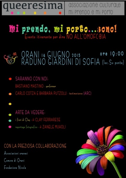 Il nome della nostra associazione "mi prendo e mi porto" non è scelto a caso ma vuole essere un invito a partecipare attivamente alla vita sociale e culturale della società. Sarebbe un grande passo se ognuno di noi portasse se stesso verso l’altro. Anche questo evento è un’occasione per incontrarci e confrontarci su un tema sempre più attuale che in un modo o nell’altro interessa e può interessare tutti. Non si tratta di pensieri lontani da noi ma si tratta di vivere la realtà, quella vera, quella quotidiana. Vi invitiamo a prendervi e portarvi ad Orani per far si che un piccolo no diventi un grande no all’omofobia.