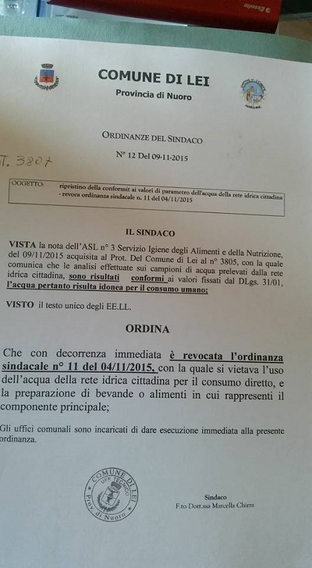 Lei. L'acqua della rete del Comune di Lei è di nuovo potabile.