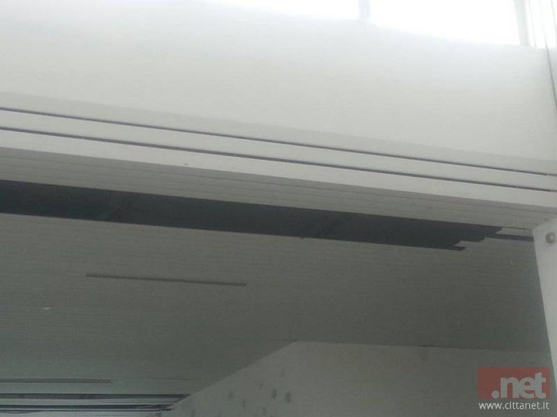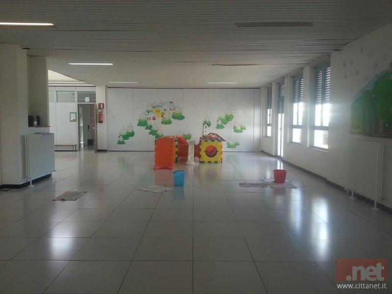L'acqua, che filtra pericolosamente dal controsoffitto ( che, come si evince dalle foto, ha qualche carenza ), ha reso impraticabile l'intera area centrale dell'asilo, quella che i bambini attraversano per accedere alle Sezioni, ma anche la stessa nella quale giocano, che è tra l'altro adiacente allo Spazio Mensa.