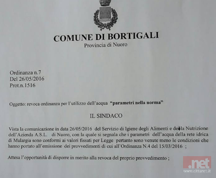 MULARGIA. L'acqua della frazione di Mulargia è di nuovo potabile: il Sindaco di Bortigali Francesco Caggiari ha potuto finalmente revocare oggi l'ordinanza che ne vietava l'utilizzo dal 15 Marzo 2016 a causa dei valori non conformi.