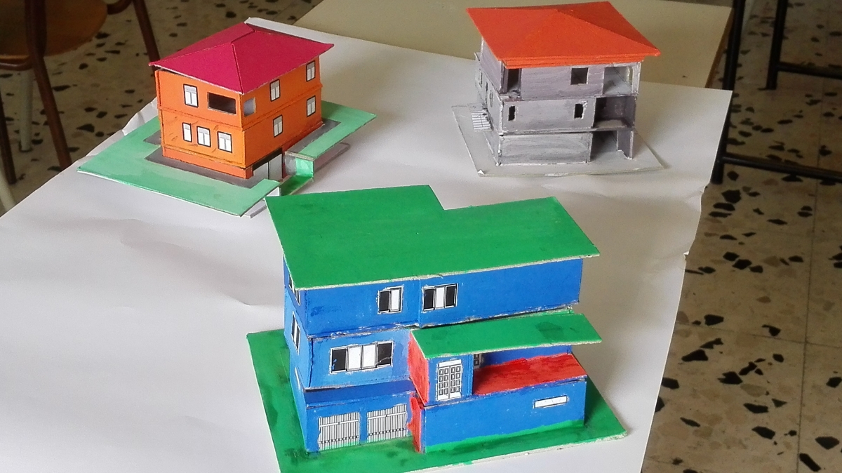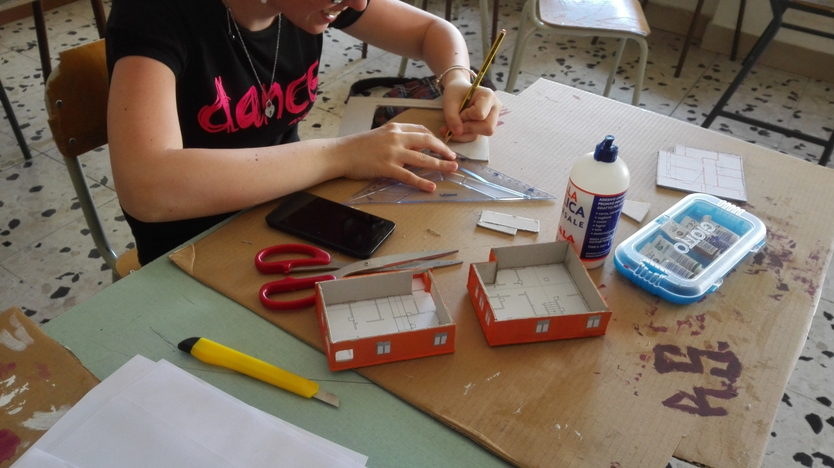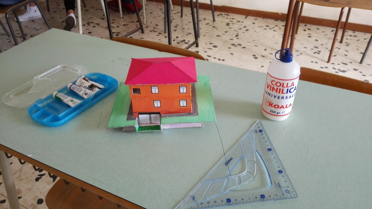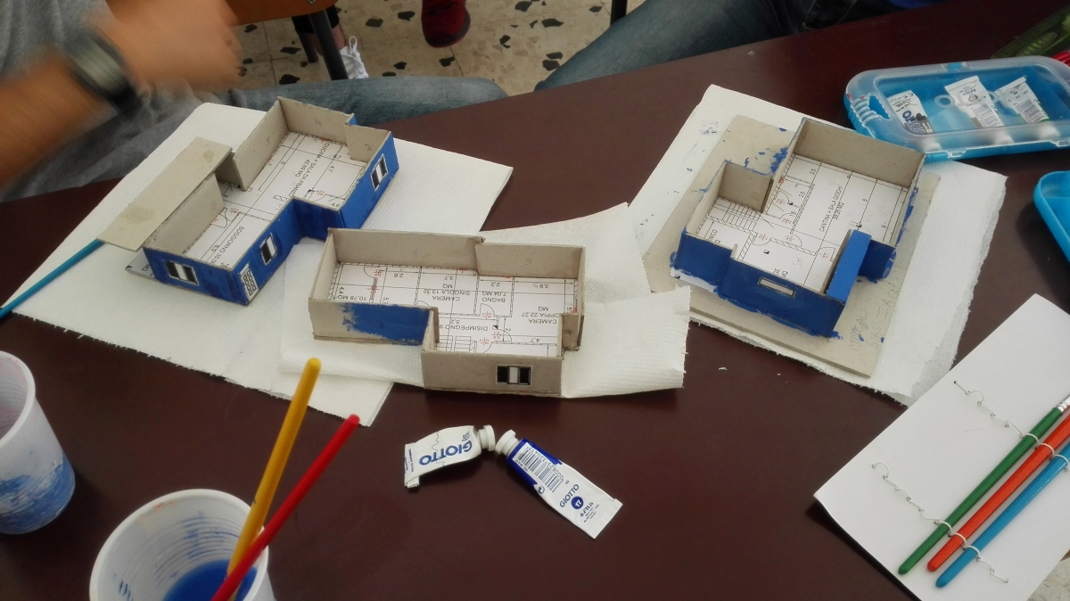 Il 1° laboratorio di modellini del corso è stato completamente realizzato in classe con l’applicazione delle competenze acquisite , modellini realizzati con l’utilizzo di materiali e attrezzature minime ( cartone pressato , squadrette , forbici , taglierine , colla , tempera e pennelli ) e riprodotti in scala 1/100 .L'esecuzione in laboratorio è stata preceduta dalla progettazione architettonica , con metodo tradizionale ( matita e squadrette) e successivamente sviluppato con disegno al computer con AUTOCAD .