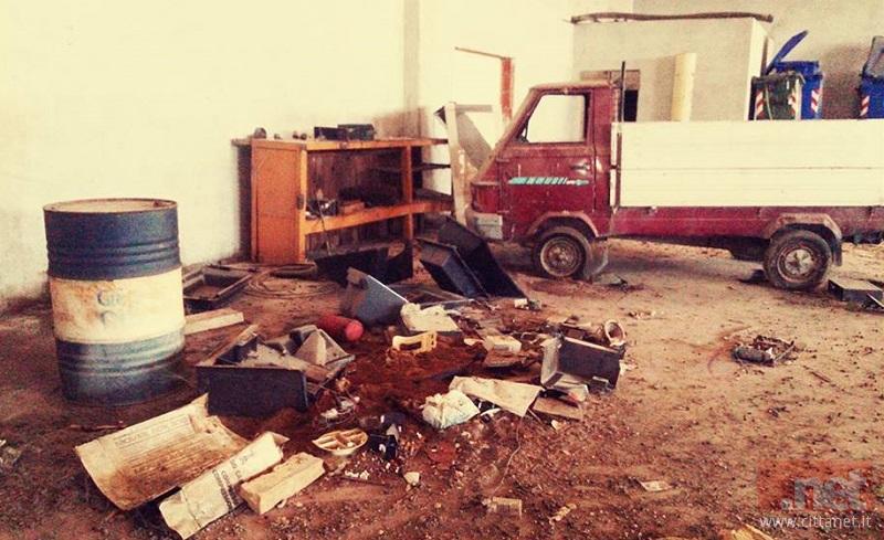 All'esterno,nel perimetro che circonda il capannone, anch'esso caratterizzato dalla presenza di rifiuti vari, il bestiame al pascolo, presumibilmente lo stesso che poi si rifugia all'interno della struttura.