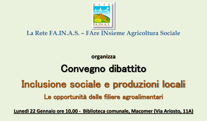 MACOMER. Si terrà Lunedì 22 Gennaio presso la Biblioteca Comunale di Macomer, a partire dalle ore 10, il terzo incontro - dibattito di FA.IN.A.S (FAre INsieme Agricoltura Sociale), la rete costituita da 14 imprese che a livello regionale sono impegnate in progetti di inclusione sociale attiva e di welfare generativo.