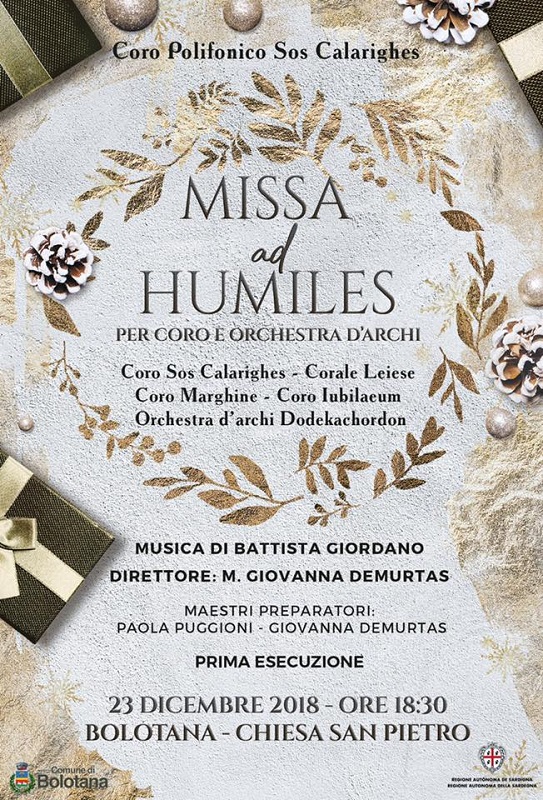 BOLOTANA. Si terrà Domenica 23 Dicembre, alle ore 18.30 presso la Chiesa Parrocchiale di San Pietro, la serata musicale organizzata dal Coro Polifonico Sos Calarighes di Bolotana nella quale andrà in scena “Missa ad Humiles”, la composizione per coro ed orchestra d'archi firmata dal musicista Battista Giordano.