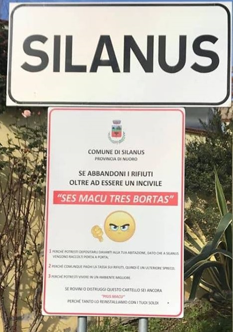 È il cartello informativo (vedi foto in alto) che l'Amministrazione di Silanus guidata dal Sindaco Gian Pietro Arca ha piazzato in bella mostra sotto quelli che segnalano l'ingresso al paese e che, senza possibilità di incorrere in equivoci, esprime in modo chiaro un concetto semplice eppure ancora non da tutti compreso: se abbandoni i rifiuti non sei solo un incivile, “ses macu tres bortas”.