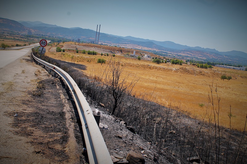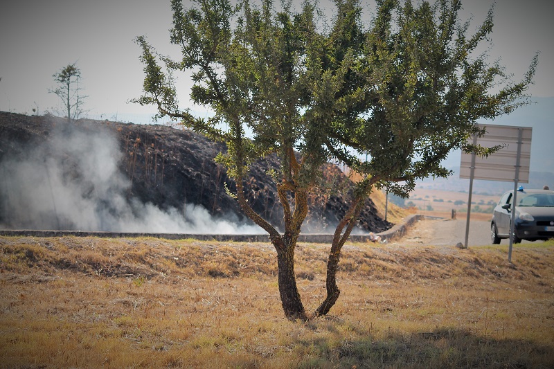 Sulla destra del cancello invece, davvero a due passi dalla terra arsa dalle fiamme, vi è una grande zona chiusa e protetta da un recinto di pannelli dai quali si affacciano cumuli di sacconi blu e bianchi. Dentro vi è lo stabilimento della Central Sughero, circondato da un ampio piazzale nel quale sono state stoccate grandi quantità di rifiuti. Solo pochi giorni fa, il 3 di agosto, con una apposita ordinanza, il sindaco di Ottana Franco Saba li aveva identificati come rifiuti speciali pericolosi e non pericolosi abbandonati e ne aveva intimato la rimozione entro 10 giorni. Fortunatamente, vista la traccia indelebile del fuoco arrivato vicinissimo al piazzale, sono scampati alla furia delle fiamme.