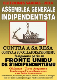 Ci rivolgiamo a tutti gli indipendentisti sardi, agli anticolonialisti, a chiunque creda in un futuro di autodeterminazione e giustizia per la nostra terra, ai lavoratori di Sardigna sempre in trincea per difendere i loro diritti, a chi il lavoro lo ha perso o lo sta perdendo, ai precari costantemente sotto ricatto, alle donne sfruttate e minacciate nel posto di lavoro, ai giovani senza più sogni, agli studenti, a chi un lavoro non lo ha mai avuto, agli emigrati che continuano a sperare e a progettare un loro ritorno possibile nella propria terra e a quelli che, loro malgrado, devono partire, ai cittadini che lottano per difendere le loro comunità dall’inquinamento, dal malaffare degli speculatori.