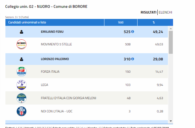 BORORE. Per un pugno di voti a Borore non si è sfiorata la soglia del 50% a favore dei Grillini: non c'è stata partita neanche qui per lo schieramento di Centro Sinistra, quasi doppiato da quello di Centro Destra che ha sfiorato il 30% sia alla Camera che al Senato.