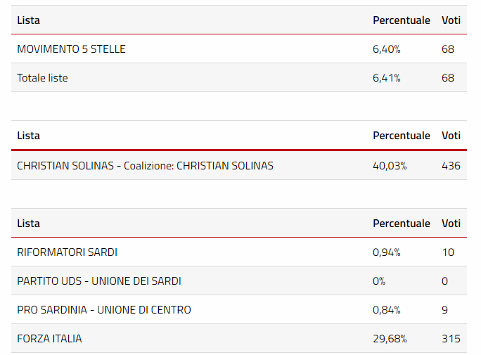 A Noragugume invece Christian Solinas incassa un 46% pieno dei voti, Massimo Zedda si è fermato al 40%, Paolo Maninchedda al 7,14%, Desogus dei 5S 3,17%, Mauro Pili 2,38%, Andrea Murgia 0,79, Lecis resta invece a zero.